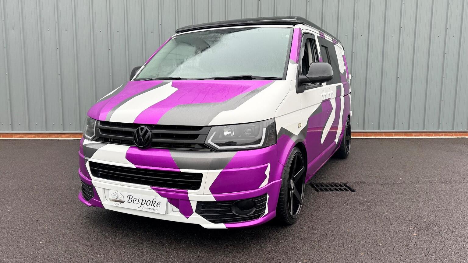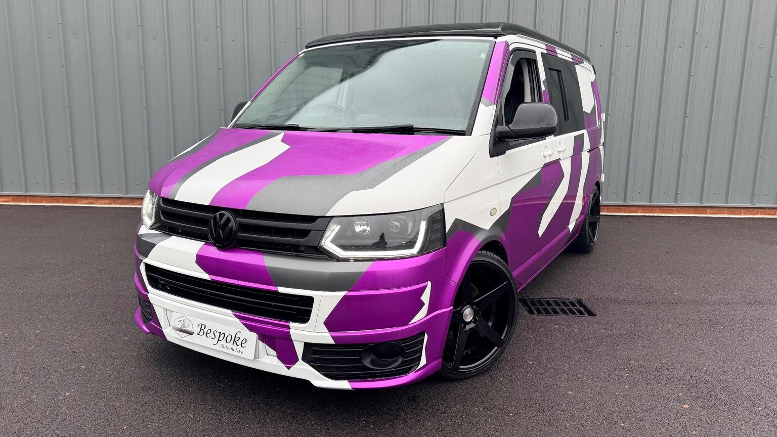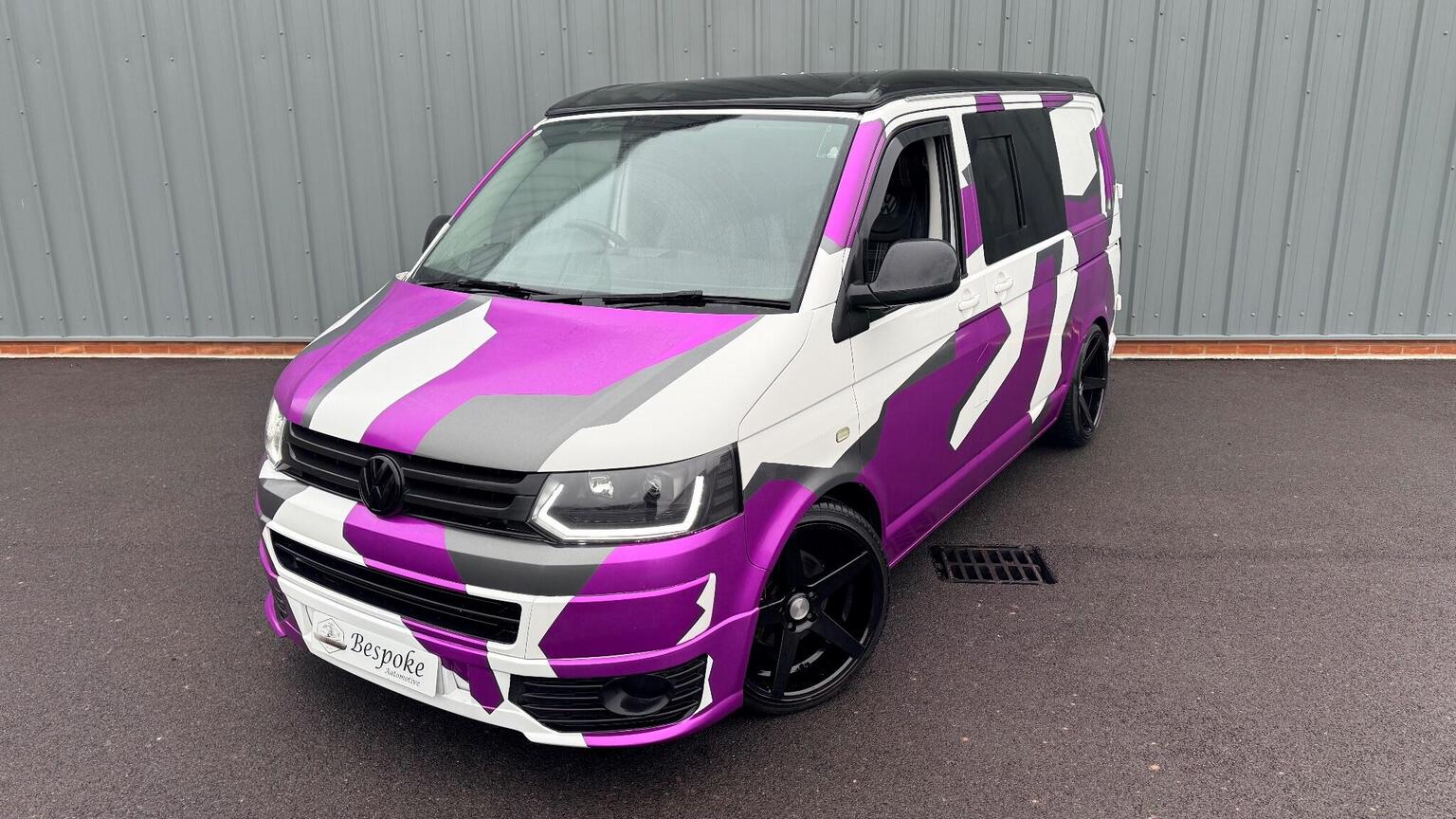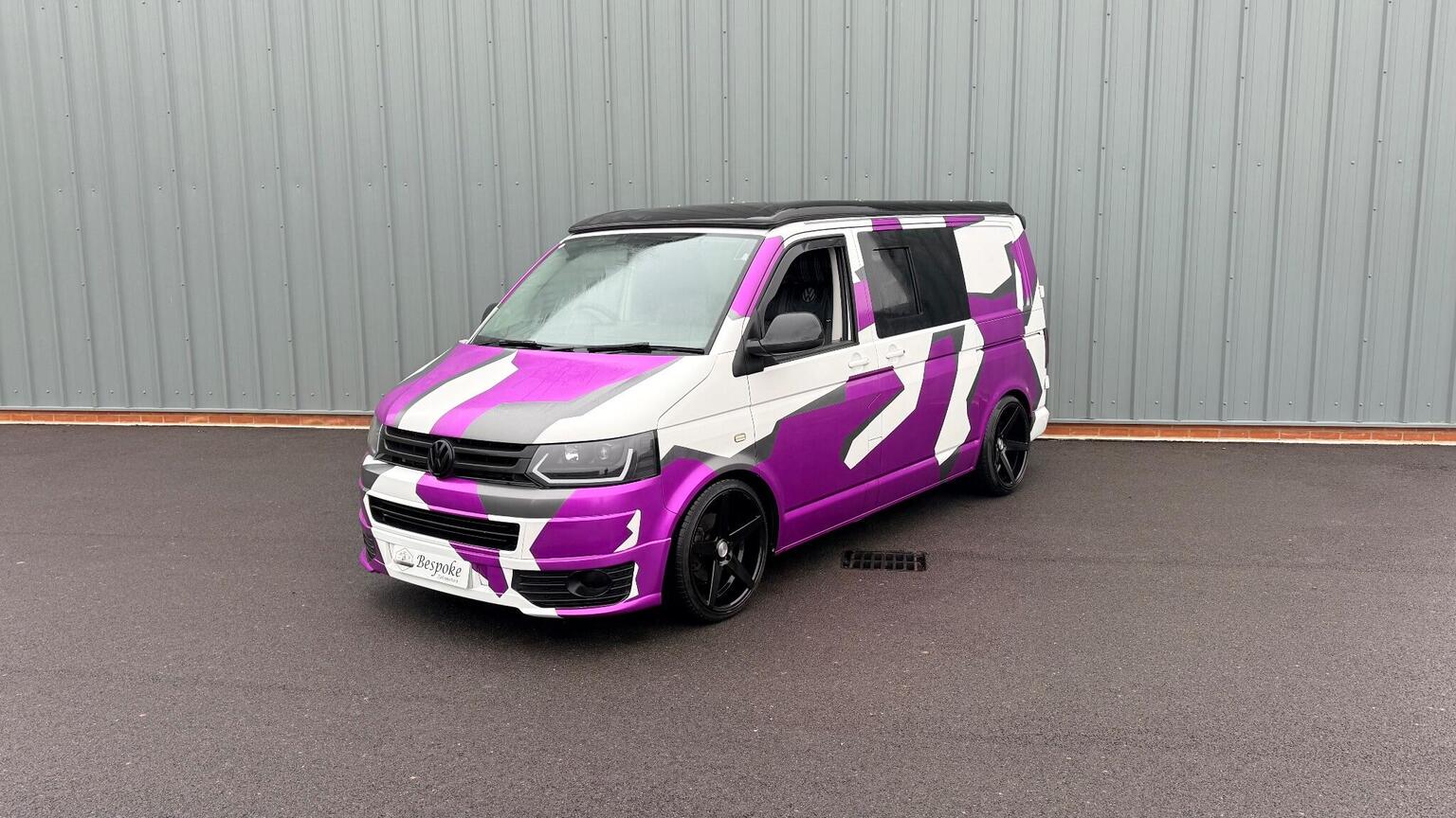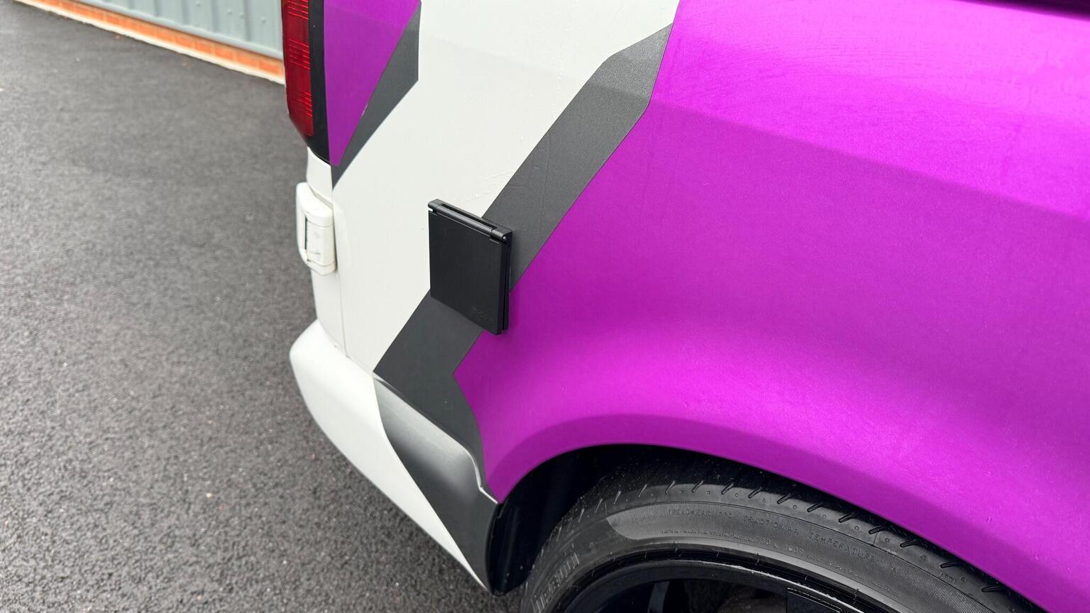 Finished in factory white paintwork complemented perfectly by a unique purple camo wrap, this van stands out from the crowd. It also benefits from upgraded black alloy wheels and a lowering kit, giving it a sporty, aggressive stance.